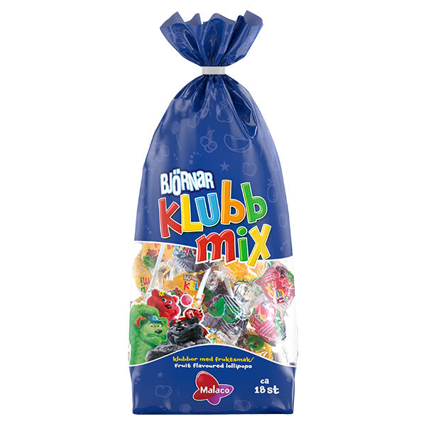 تحتوي حقيبة Björnar Klubbmix على مصاصات ذات نكهات فاكهية متنوعة.