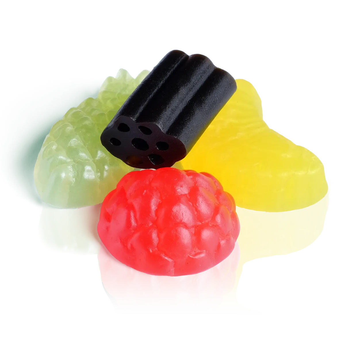 المكونات: سكر، شراب الجلوكوز، شراب الجلوكوز والفركتوز، نشا، دقيق القمح، دبس السكر، حمض (e270)، مرطبات (سوربيتول، جلسرين)، مستخلص عرق السوس، ملح، زيوت نباتية (جوز الهند، بذور اللفت)، نكهات، ألوان (e153، e160c، e100، e141)، مركز من (الجزر، الكشمش الأسود)، عامل معالجة السطح (شمع كارنوبا)، مثبت (e471)، دهن جوز الهند